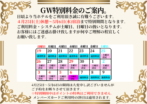 4月25日(土)休憩~5月6日(月)宿泊まで特別期間と致しましてご利用料金・システムが土曜日、日曜日と同じ扱いになります。